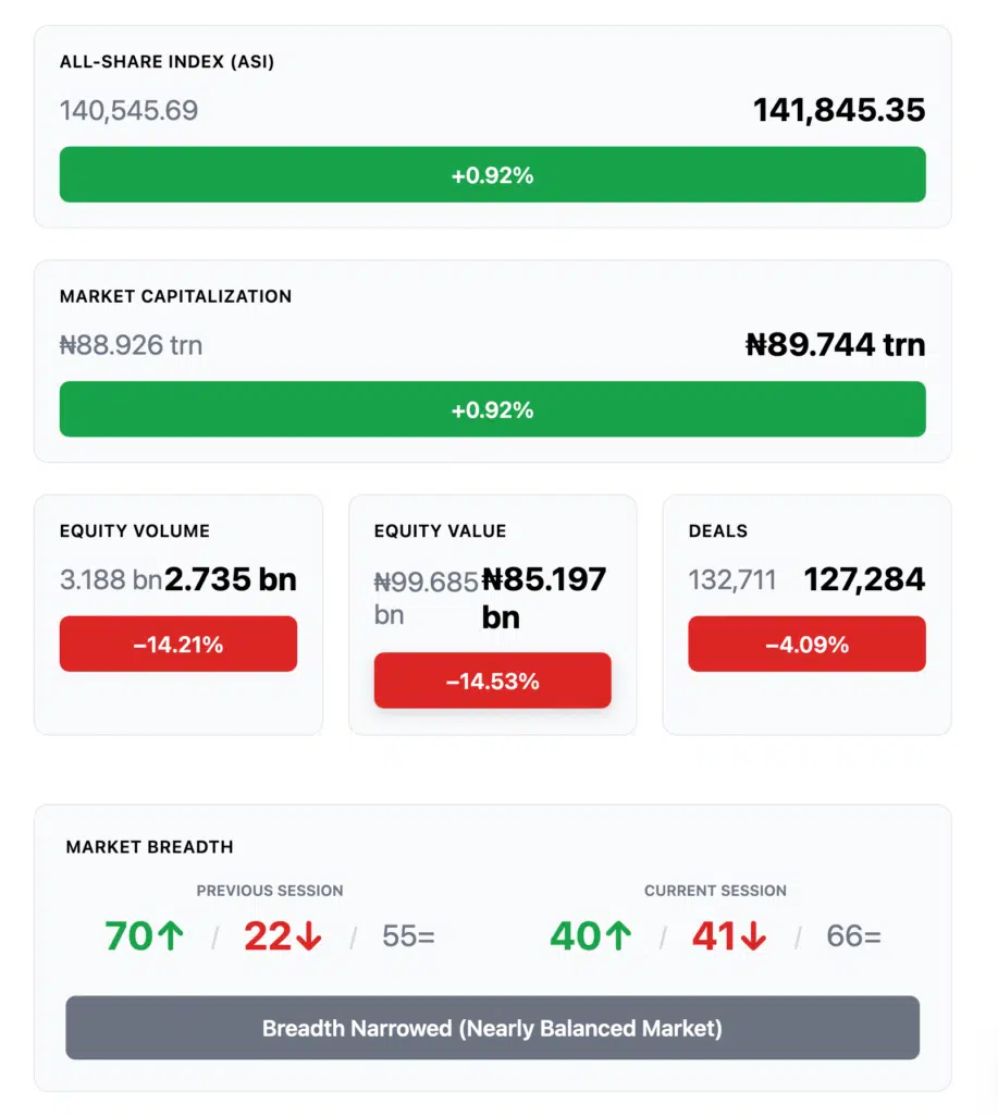 Sometimes the market whispers; last week it spoke plainly. The NGX closed higher, with the All-Share Index (ASI) adding 0.92% to finish at 141,845.35, and a market capitalization of ₦89.744 trillion. Gains were not fireworks—they were deliberate steps forward in a market sorting leaders from passengers.