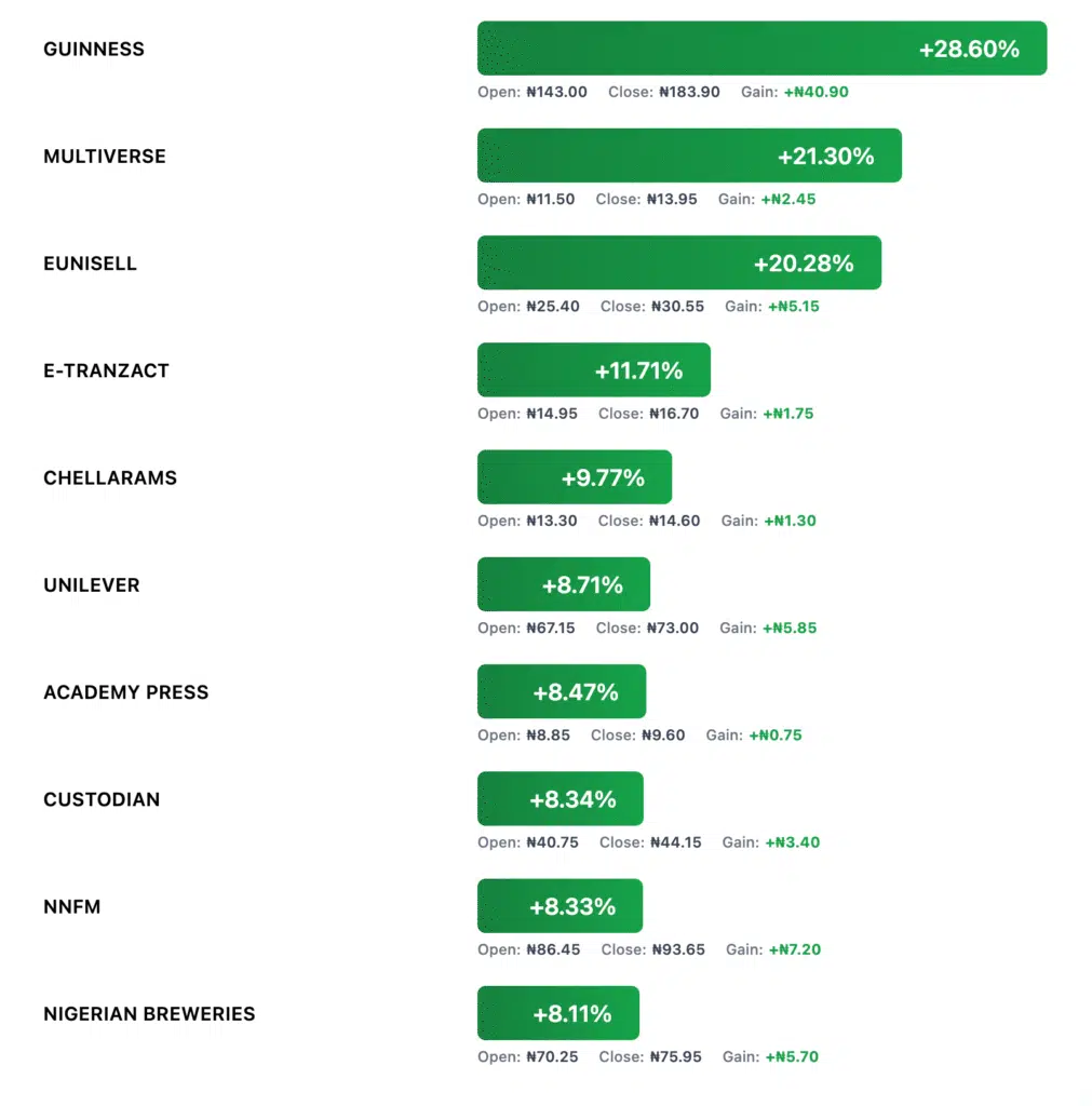 Take: Consumer staples and selected mid‑caps dominated. If you held Guinness, you banked a 28.6% return in five sessions — momentum plus defensiveness.